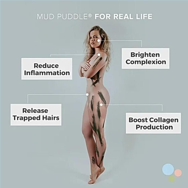 Mud Puddle soveltuu erinomaisesti sisäänkasvaneiden karvojen, psoriasiksen ja ihottumien hoitoon, sekä selluliittihoitoihin. Naamio on jauhemainen, hyvin säilyvä, helppo sekoittaa veteen ja levittää iholle.